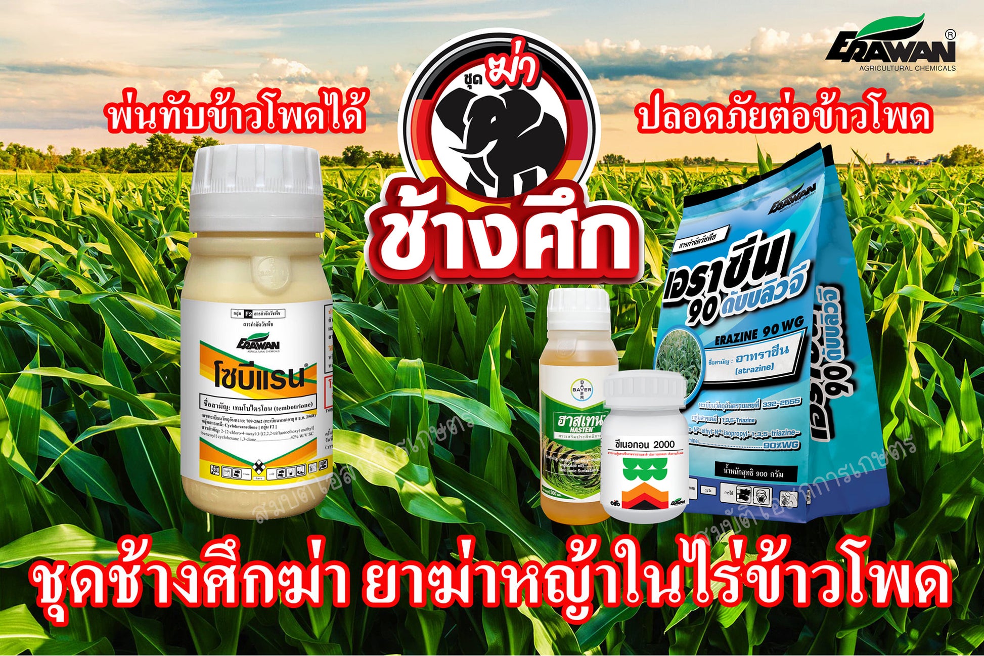 ชุดช้างศึกฆ่า คือชุดผสมสารกำจัดวัชพืชที่ออกแบบมาเพื่อ กำจัดหญ้าในไร่ข้าวโพดโดยเฉพาะ เหมาะสำหรับใช้หลังปลูกข้าวโพด (7–15 วัน) หรือเมื่อวัชพืชมีใบอ่อน 3–5 ใบ สามารถพ่นทับยอดข้าวโพดได้โดยไม่เป็นอันตรายต่อข้าวโพด