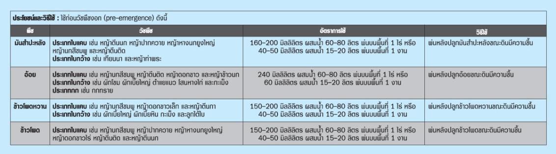 - ใช้สำหรับควบคุมวัชพืชก่อนการงอก (pre-emergence) ในพืชไร่ต่าง ๆ โดยเฉพาะในมันสำปะหลัง อ้อย และข้าวโพด โดยสามารถกำจัดวัชพืชประเภทต่าง ๆ เช่น