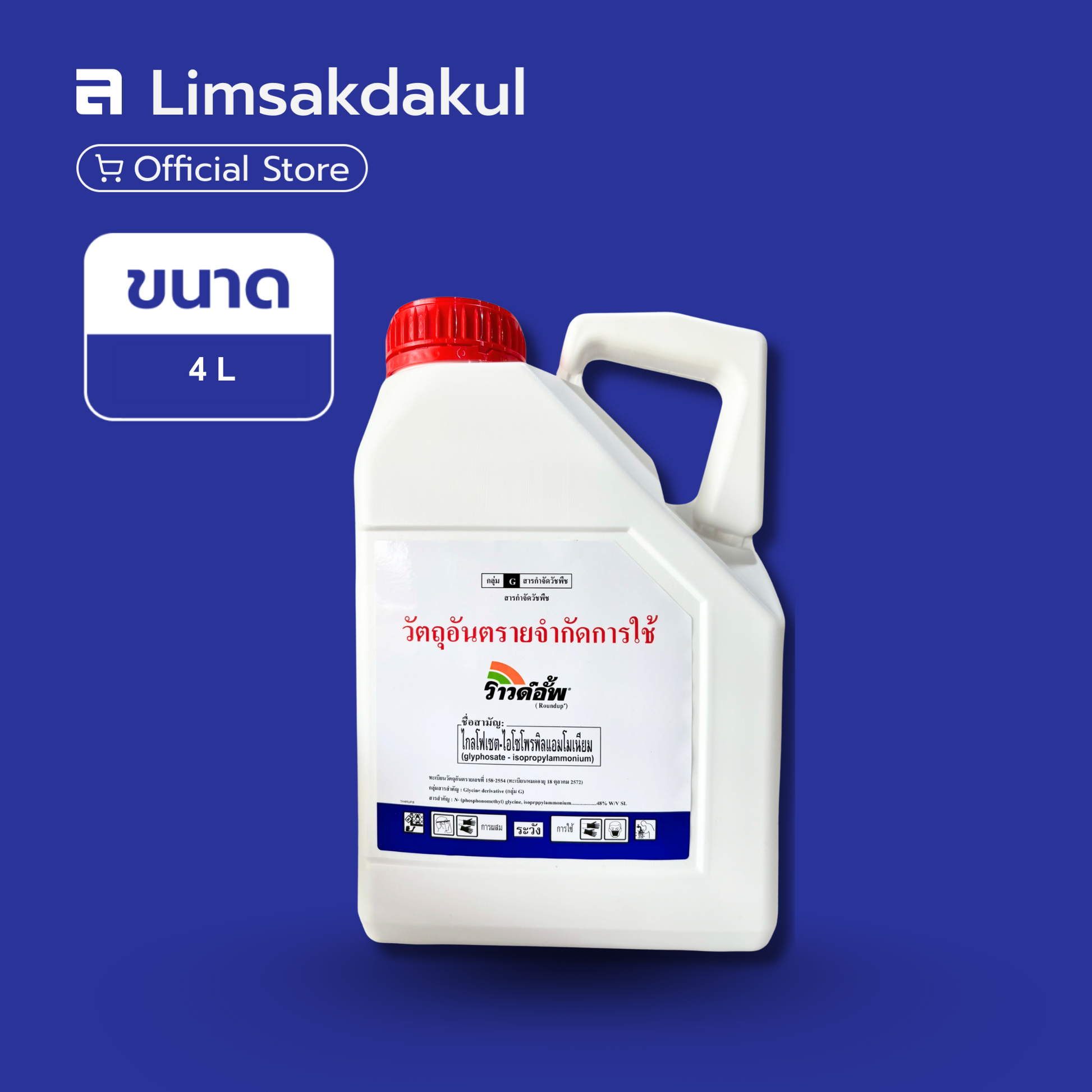 - สารสำคัญ: N-(phosphonomethyl) glycine, isopropylammonium 48% W/V SL