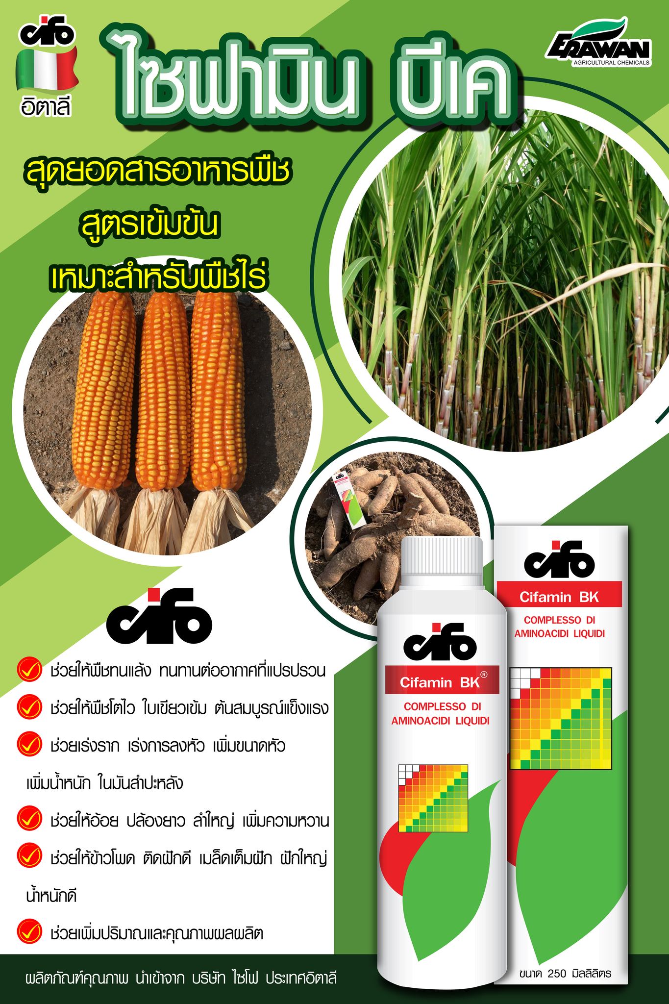 ไซฟามิน บีเค (Cyfamin BK) เป็นผลิตภัณฑ์เสริมการเจริญเติบโตของพืช ช่วยบำรุง ผลอ่อน ดอก ใบ เมล็ด และท่อนพันธุ์ ให้แข็งแรงสมบูรณ์ ลดการร่วงของผลอ่อน และเพิ่มคุณภาพผลผลิต เหมาะสำหรับไม้ผล พืชผัก ธัญพืช และไม้ดอกไม้ประดับ