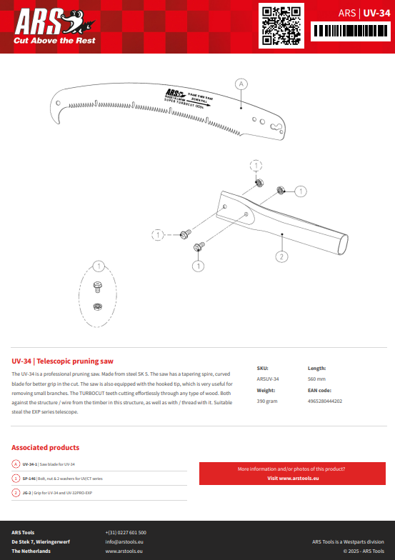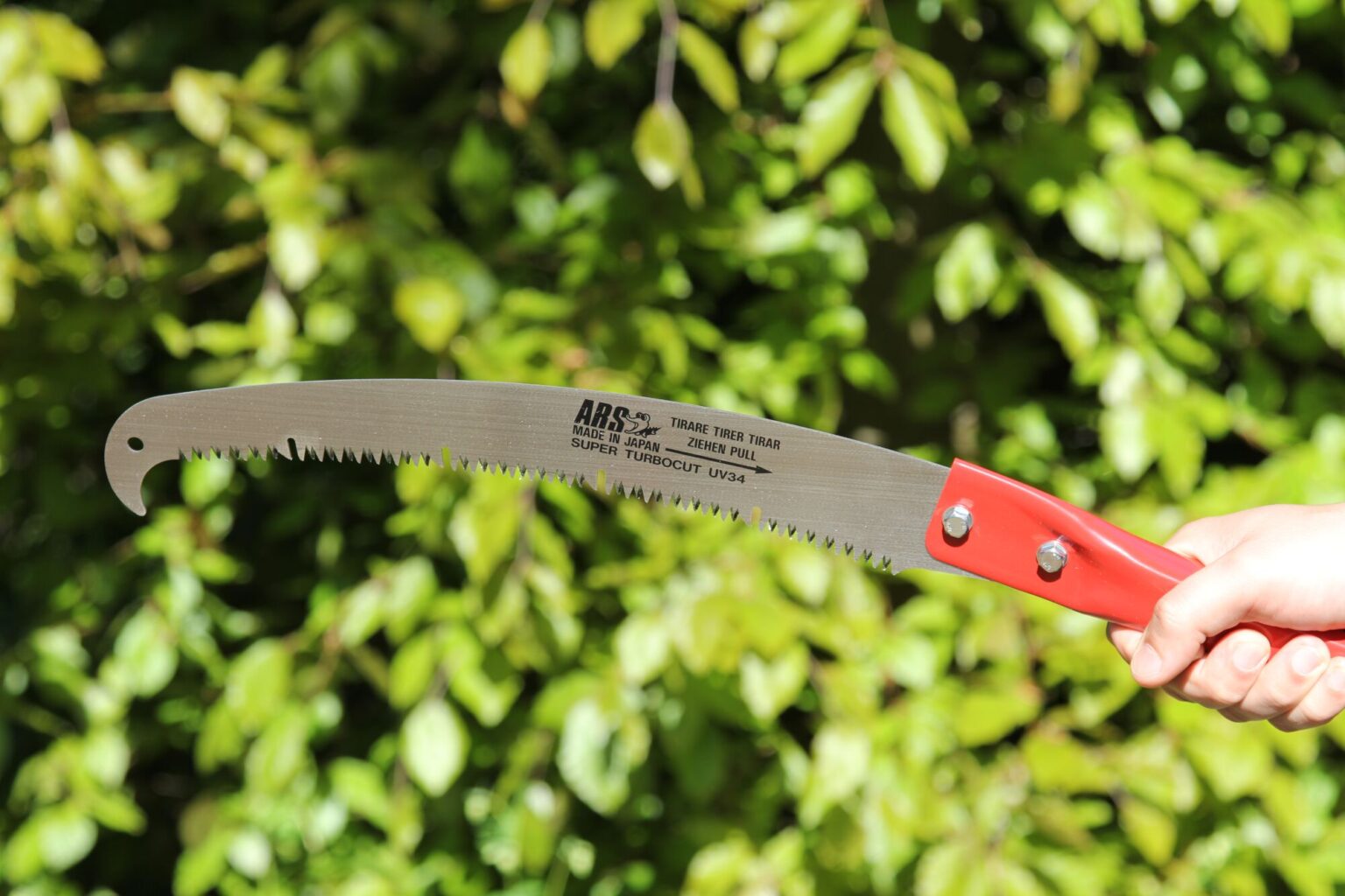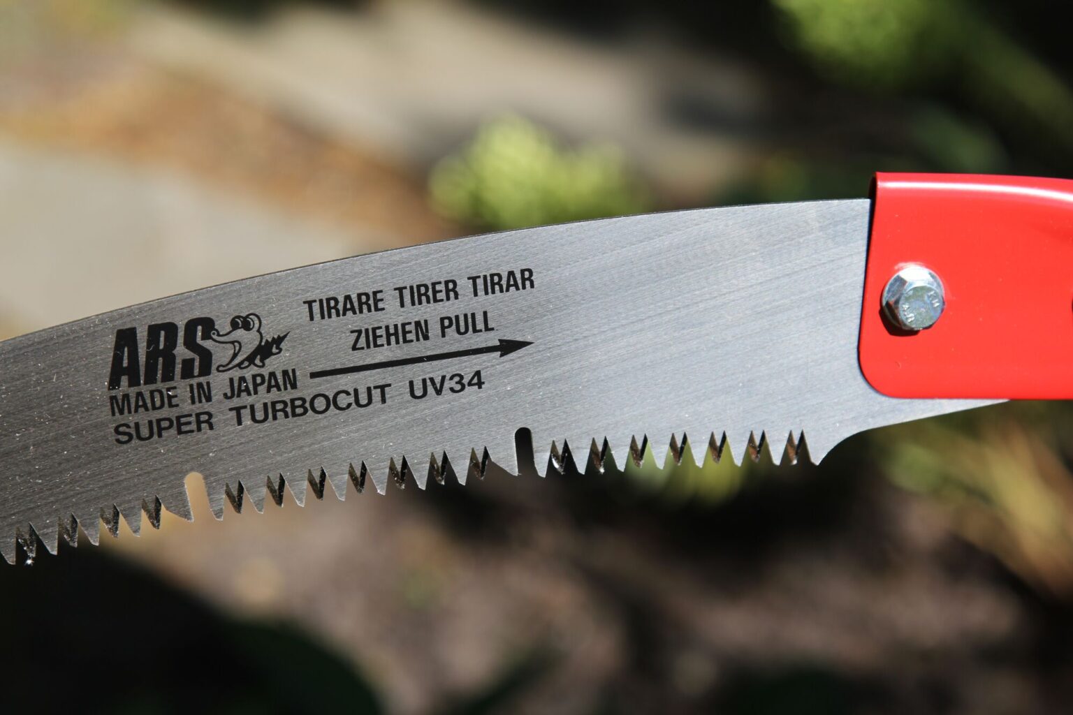 ARS UV-34 คือเลื่อยตัดกิ่งไม้ระดับมืออาชีพจากญี่ปุ่น มาพร้อมใบเลื่อยโค้งขนาด 340 มม. ปลายใบมีลักษณะเป็นตะขอ ช่วยเกี่ยวกิ่งไม้เล็กหรือเศษกิ่งที่ตัดได้อย่างสะดวก ใบเลื่อยผลิตจากเหล็ก SK-5 แข็งแรง ทนทาน ฟันเลื่อยแบบ TURBOCUT คมพิเศษ สามารถตัดไม้ได้ทุกประเภทอย่างง่ายดาย ทั้งตามแนวเสี้ยนและขวางแนวเสี้ยน