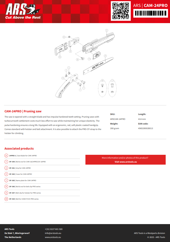 ARS CAM-24PRO คือเลื่อยตัดกิ่งไม้คุณภาพสูงจากญี่ปุ่น ออกแบบมาเพื่องานตัดที่ต้องการความแม่นยำสูง เหมาะสำหรับผู้ใช้งานระดับมืออาชีพ ใบเลื่อยตรงแบบเรียวขนาด 240 มม. มาพร้อมฟันเลื่อยแบบ Turbocut ที่ผ่านการชุบแข็งด้วยเทคโนโลยี Impulse Hardening ให้ความคมยาวนานและตัดได้ลื่นไม่สะดุด
