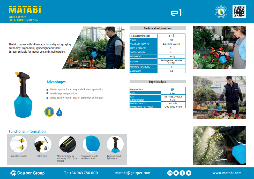 Matabi E1 คือเครื่องฉีดพ่นไฟฟ้าคุณภาพสูงจากประเทศสเปน ขนาดความจุ 1 ลิตร เหมาะสำหรับการดูแลต้นไม้ ดอกไม้ พืชสวน ทั้งในบ้าน ระเบียง และสวนขนาดเล็ก ใช้งานง่ายเพียงกดปุ่ม ไม่ต้องออกแรงฉีด ประหยัดแรง ประหยัดเวลา และใช้งานได้เงียบ น้ำหนักเบา จับถนัดมือ